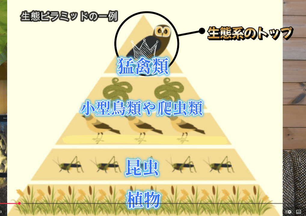 ピラミッドの下には植物、その上には昆虫、小型鳥類、